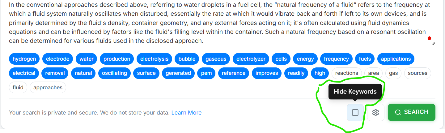 When this third Option is ON, we will query our secure OpenAI API with a query that includes your Text to get an AI Summary of your Input Text to compare with text the same as we do with each Search Results texts. In addition, we submit your text along with the AI Summary of each Search Result text. In addition, we also create an AI Comparison of your text with each Search Result text. This gives you a quick analysis of the similarities between any of your inventive ideas that are also contained in each results document.