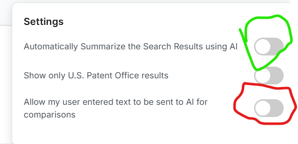The First ON/OFF button circled in Green enables “Automatic Summarize the Search Results using AI.” We believe this First Option is safe for you to use because your results documents are all “published and publicly available documents” on the Internet. This should be true for our current Google Patents search site and any future search sites we expect to add such as Google Scholar. Submitting search results text to OpenAI API will not divulge your proprietary Input Text.